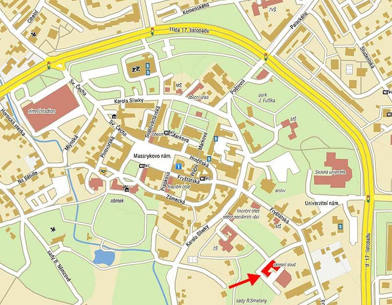MHD linka č. 511, 512, 513,514, 516, 518, 519 a 520 (vystoupit na zastávce Fryštát-univerzita, projít kolem budovy Slezské univerzity a ČEZu a cca 50m od silnice se nachází budova Okresního soudu v Karviné).